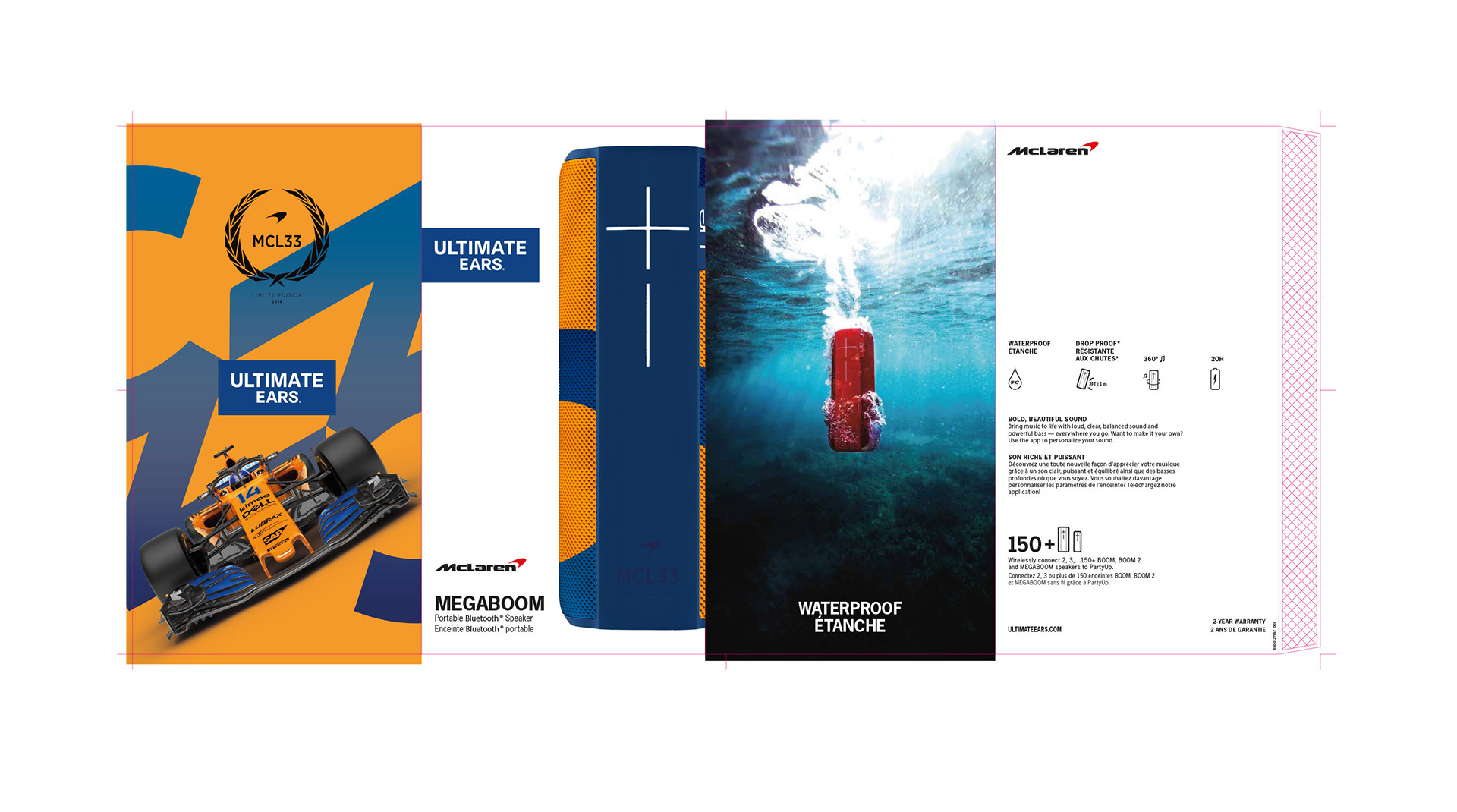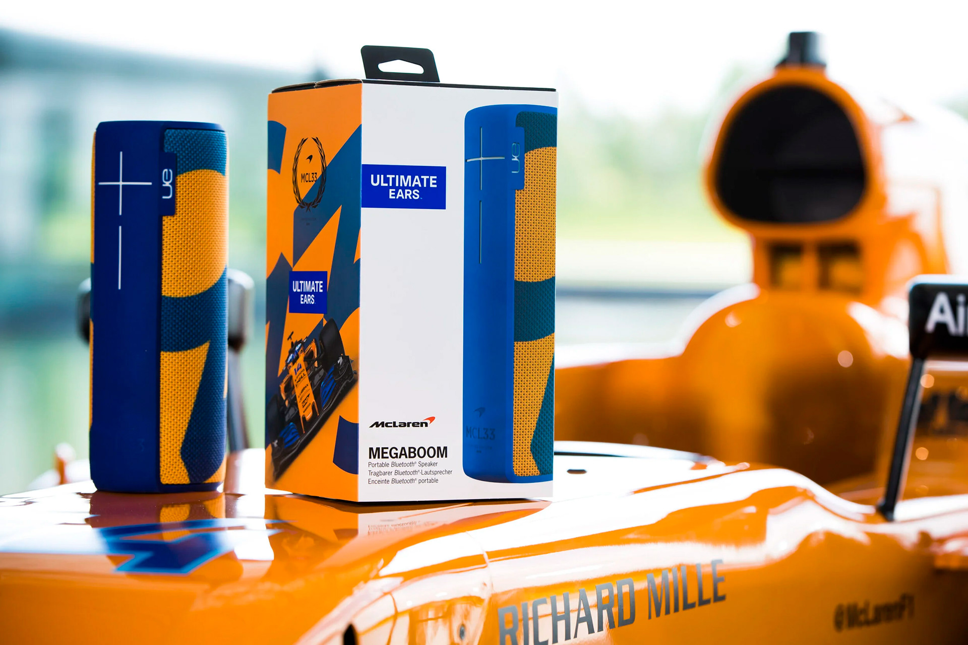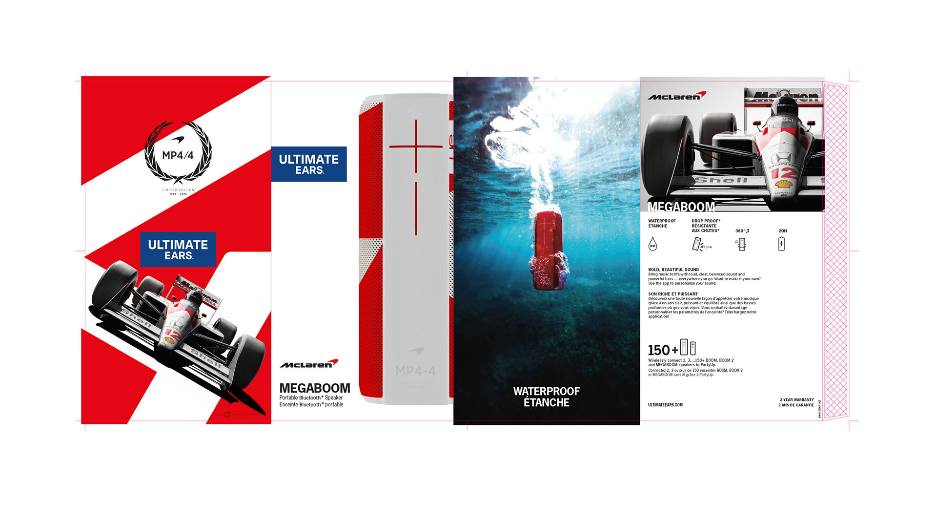 Two limited edition packaging designs for Ultimate Ears Megaboom speakers. One design linked to the iconic McLaren MP4/4 and the other linked to the current F1 car MCL33.