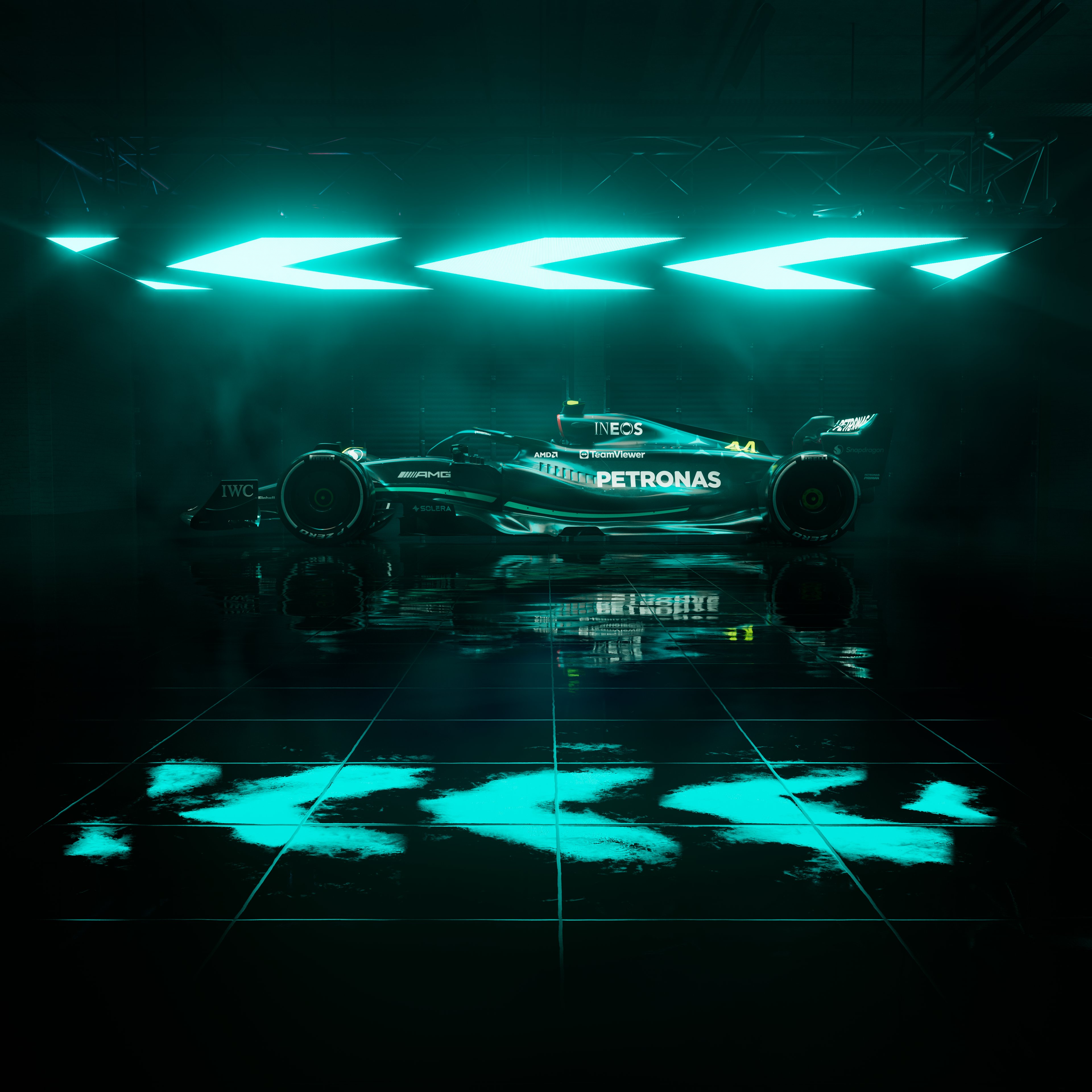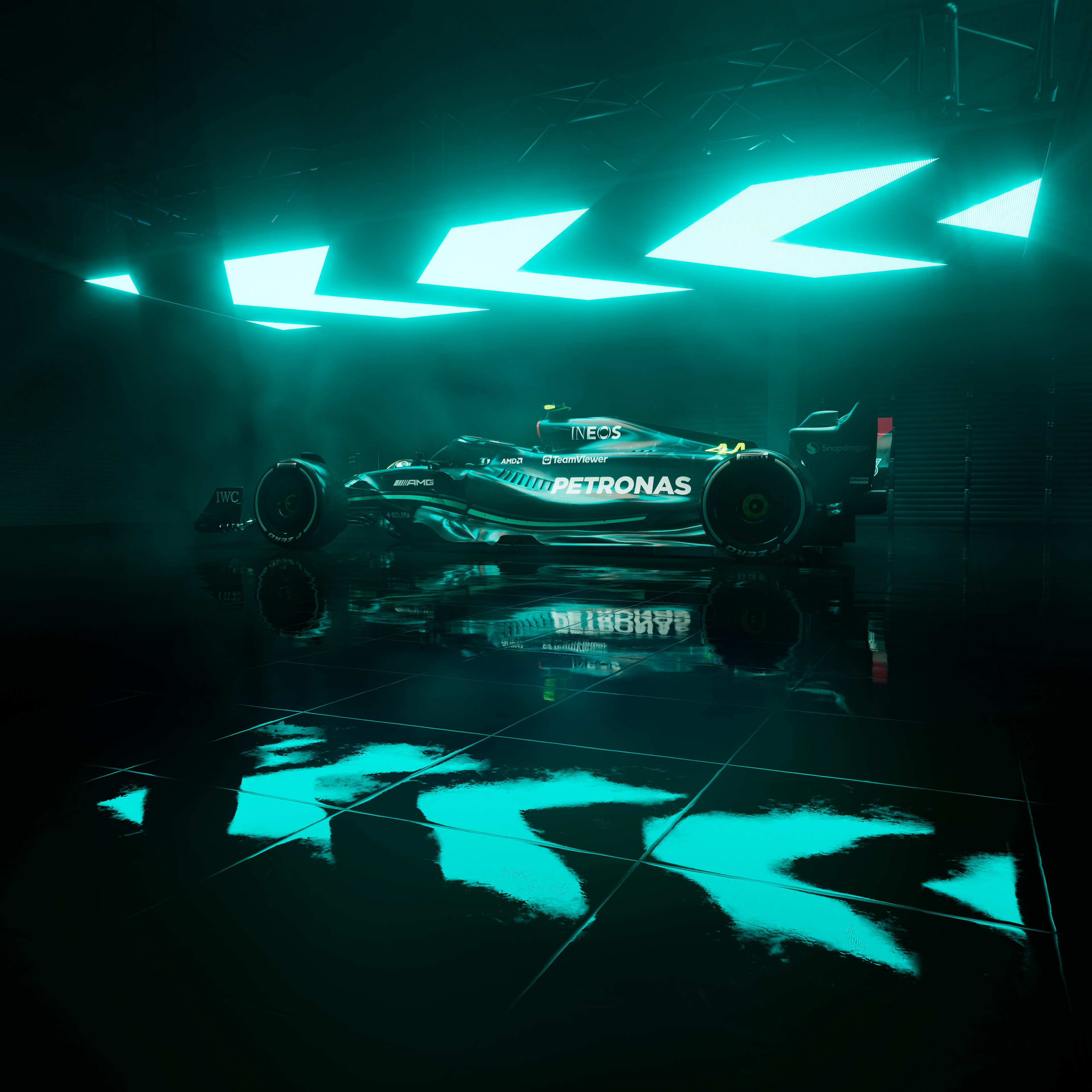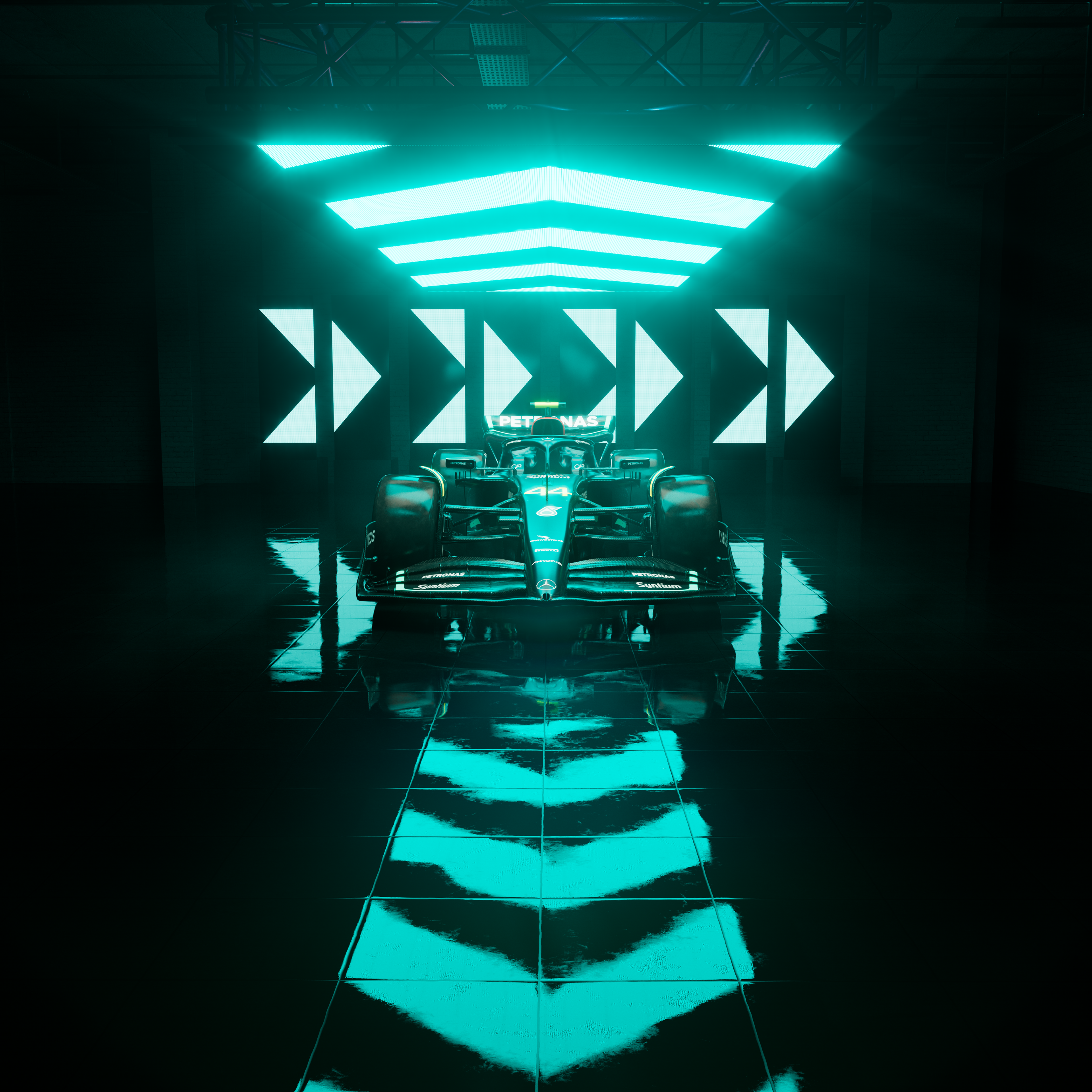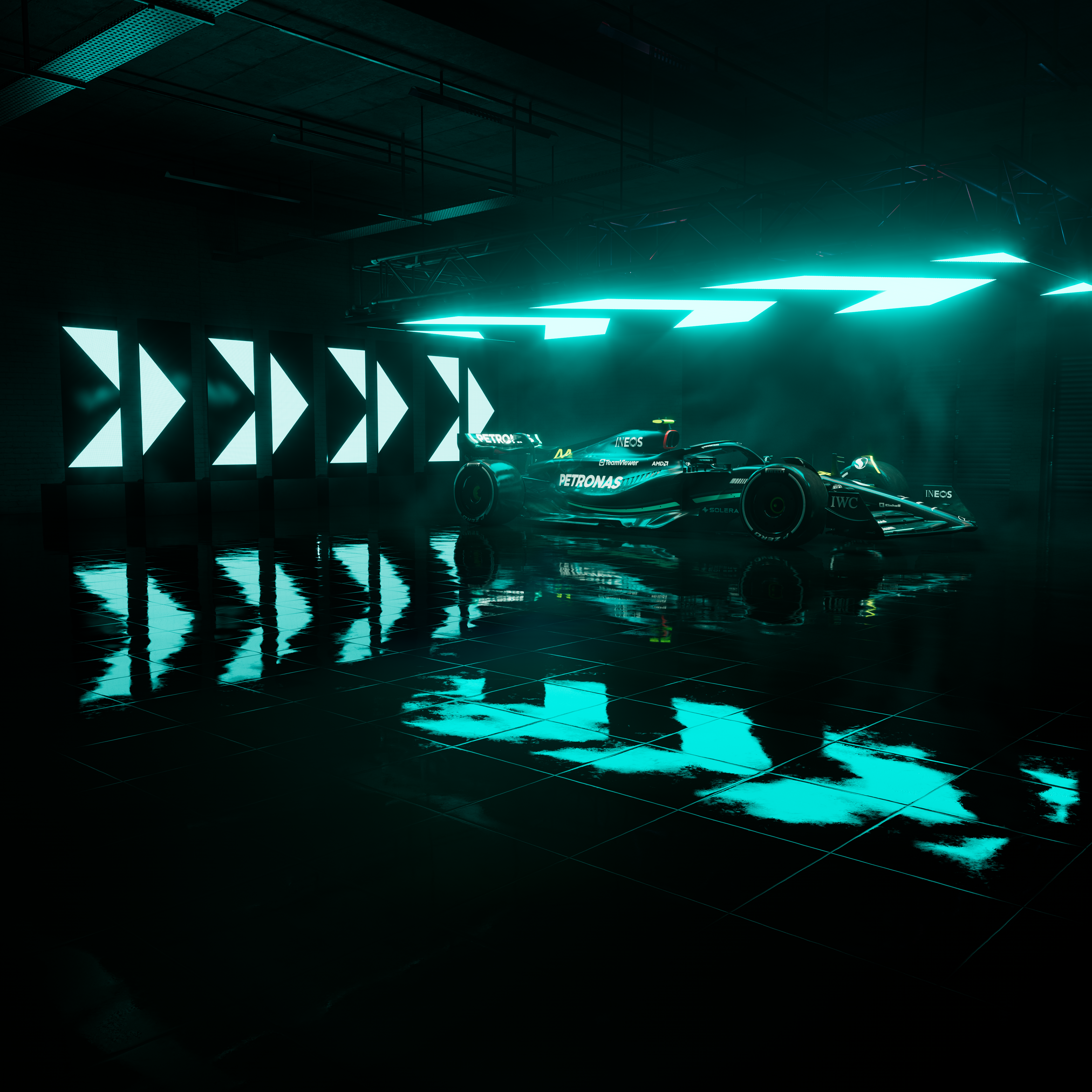I created the following dark atmospheric renders of the Mercedes AMG Petronas Formula 1 race car, for use in new business pitches work and other editorial applications.
